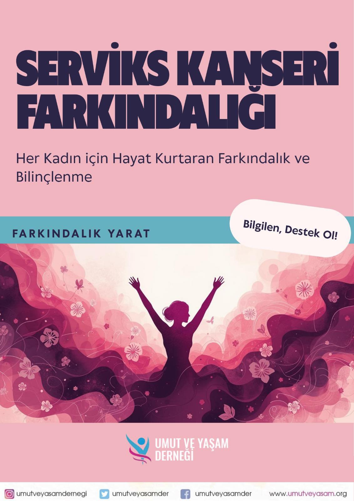 Biz Umut ve Yaşam Derneği** olarak; her kadının bilgiye, taramaya ve sağlıklı yaşama eşit şekilde ulaşabilmesini savunuyoruz. Farkında olmak, fark yaratır. Kendin için, sevdiklerin için bir adım at; kontrollerini erteleme.